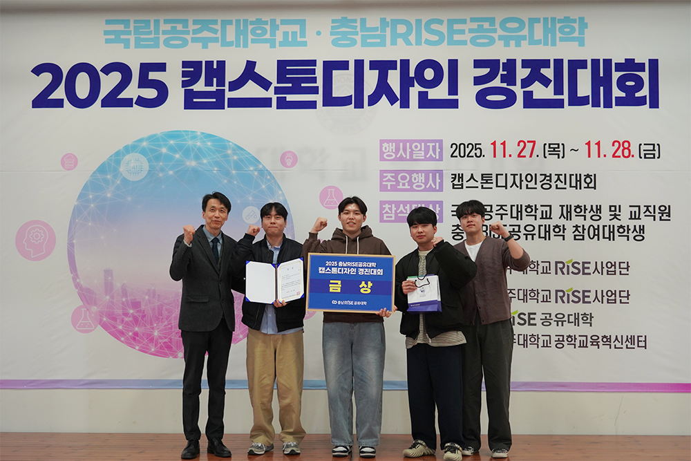 단국 C-RISE 사업단(단장 백동헌)이 지난 11월 28일 국립공주대학교 천안캠퍼스에서 개최된 ‘2025년 충남 RISE 공유대학’ 발대식 및 업무협약식에 참여해 대학 간 혁신교육 협력의 청사진을 공유하고, 같은 날 열린 캡스톤디자인 경진대회에서는 금상과 은상을 수상하며 역량을 보여줬다. △‘Re:volt’ 팀이 금상을 수상했다. △경진대회 기념사진 캡스톤디자인 경진대회에서는 우리 대학 에너지융합전공 소속 5개 팀이 참가해 전공 특화 과제를 발표했다. 이 중 ‘Re:volt’ 팀(에너지공학과 김종찬 외 5명)이 하이브리드 스마트 센서를 개발해 금상을 ‘Turn&On’ 팀(에너지공학과 김수찬 외 2명)은 문의 회전력 이용한 지문인식 사물함을 선보이며 은상을 수상해 현장 중심 실무역량을 인정받았다. △충남 RISE 공유대학 발대식 같은 날 진행된 발대식 및 업무협약식에서는 충남 RISE 공유대학에 참여하는 도내 20개 대학이 모여 공동 교육과정 운영과 학사 협력체계 구축에 뜻을 모았다. 각 대학은 ▶충남RISE공유대학 교육과정 공동 운영 ▶충남RISE공유대학 공동학위 ▶참여대학 간 학점·학기 교류 및 상호 학점 인정 ▶우수 인력 지역 정주를 위한 프로그램 상호 교류 및 협력 등에 나선다. △천안 AI 어반테크 글로벌 서포터즈’로 선발된 학생들이 기념사진을 촬영했다. 한편 단국 C-RISE 사업단은 지난 11월 2일부터 8일까지 스페인 바르셀로나에서 열린 ‘스마트시티 엑스포 월드 콩그레스(SCEWC 2025)’에 천안관 운영에도 함께 참여했다. ‘천안 AI 어반테크 글로벌 서포터즈’로 선발된 학생 10명은 기업 홍보, 바이어 응대, 콘텐츠 제작 등 현장 실무를 지원하며 글로벌 역량을 키웠다. [대학뉴스 제보] 죽전 홍보팀 : 031-8005-2032~5, 천안 홍보팀 : 041-550-1061