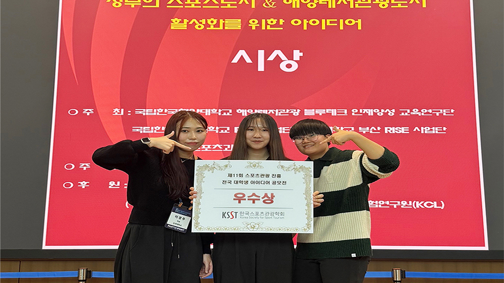 △(왼쪽부터)이경주, 이채민, 김민정 학생   스포츠경영학과 학생팀(이채민, 김민정, 이경주, 이상 스포츠경영학과 2학년)이 12월 19일(금) 부산 벡스코 컨벤션센터에서 열린 「제11회 스포츠관광진흥 대학생 아이디어 공모전」에서 우수상을 수상했다. 이번 공모전은 한국스포츠관광학회와 한국해양관광학회가 공동 주관했다. 예선을 거쳐 본선에 진출한 18개 팀이 경쟁을 펼친 가운데, 우리 대학 학생팀은 “움직임에 에너지가 되는 RE100 도시, 태안”을 주제로 지역 기반 스포츠관광 활성화 방안을 제안해 높은 평가를 받았다. 학생팀은 화력발전소 폐쇄에 따른 지역 변화에 대응해, 태안의 자연·관광 자원을 활용한 트레킹 중심 ‘스포츠 에너지 도시’ 조성 방안을 구체화했다. 친환경 에너지 전환 흐름과 스포츠관광을 접목해 지속가능한 지역 발전 모델을 제시했다는 점에서 심사위원들의 호평을 받았다. 이채민 학생은 “도전할 수 있었던 것 자체가 의미 있었고, 다양한 대학의 학생들과 경쟁하며 많은 것을 배울 수 있어 값진 시간이었다”고 소감을 전했다.  [대학뉴스 제보] 죽전 홍보팀 : 031-8005-2032~5, 천안 홍보팀 : 041-550-1061