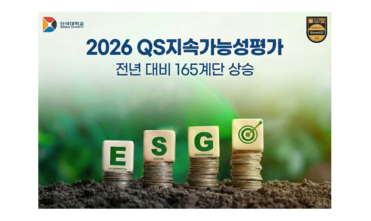 세계대학 640위, 국내대학 27위, 아시아대학 175위 올라 지배구조 부문 국내 9위, 환경·사회 지표 대폭 개선 우리 대학이 영국 글로벌 평가 기관 QS(Quacquarelli Symonds)가 발표한 「2026 QS 지속가능성평가」에서 전년 대비 165계단 상승한 세계 640위를 기록했다. 국내 대학 가운데 27위, 아시아 대학 가운데는 175위에 올랐다. 평가 대상 대학이 지난해 1,751개교에서 2,002개교로 확대된 가운데 이루어낸 성과다. △우리 대학은 지속가능한 교육·연구 환경 조성을 위한 대학평가 체계를 정비해 전년 대비 165계단 상승하는 성과를 거뒀다. QS 지속가능성평가는 대학의 역량을 ESG(환경·사회·거버넌스) 관점에서 분석하는 지표로 ▲환경영향(45점 : 환경지속가능성·환경교육·환경연구) ▲사회영향(45점 : 건강&웰빙·평등·교육영향·고용가능성 및 기회·지식교환) ▲지배구조(10점)로 구성된다. 평가결과는 다음 해 QS세계대학평가에 반영된다. 우리 대학은 올해 환경과 사회 분야에서 두드러진 상승세를 보였다. 「환경영향」 부문은 전년 대비 220계단 상승했으며 세부 지표인 '환경 지속가능성'은 334계단 뛰어올랐다. 「사회영향」 부문 역시 215계단 상승했고 세부 지표인 '평등'이 293계단, ‘교육영향’ 이 239계단 상승하며 지표가 크게 개선됐다. 특히 「지배구조」 부문에서는 국내 9위를 차지하며 우수한 평가를 받았다. 우리 대학은 SDGs 실천 강화를 위해 SDGs 실천 선언식을 시작으로 '단국SDGs홈페이지' 구축, SDGs 보고서 발간 등 체계적인 관리체계를 확립하고 대학평가 지표와 연계해왔다. 특히 교육 및 연구 역량 강화를 위해 ▲ESG경영학과(경영대학원) 및 탄소중립학과(행정법무대학원) 개설 ▲학부·대학원 지속가능발전(SDGs) 교과목 개설을 추진했다. 2026학년도 1학기부터는 SCI급(SCIE, SSCI, A&HCI, SCOPUS) 학술지 논문 중 SDGs 키워드가 포함될 경우 논문당 연구실적 대체인정 점수 10점을 부여해 관련 연구를 장려할 방침이다. 친환경 캠퍼스 조성에도 앞장서고 있다. ▲국내 대학 최초 친환경 수소 전기 셔틀버스 도입 ▲DKU 대학생 환경교육단 출범 ▲전 건물 LED·공조기 교체 등 지속가능성 프로그램을 추진해 실질적인 인프라 개선을 이끌어왔다. 김재일 대학평가전략위원장(대외부총장)은 “이번 성과는 지속가능한 교육·연구 환경을 조성하기 위한 구성원 모두의 노력이 반영된 결과"라며 "앞으로도 SDGs 기반의 교육과 연구를 강화해 지속가능성을 선도하는 대학으로 도약하겠다”고 밝혔다. [대학뉴스 제보] 죽전 홍보팀 : 031-8005-2032~5, 천안 홍보팀 : 041-550-1061