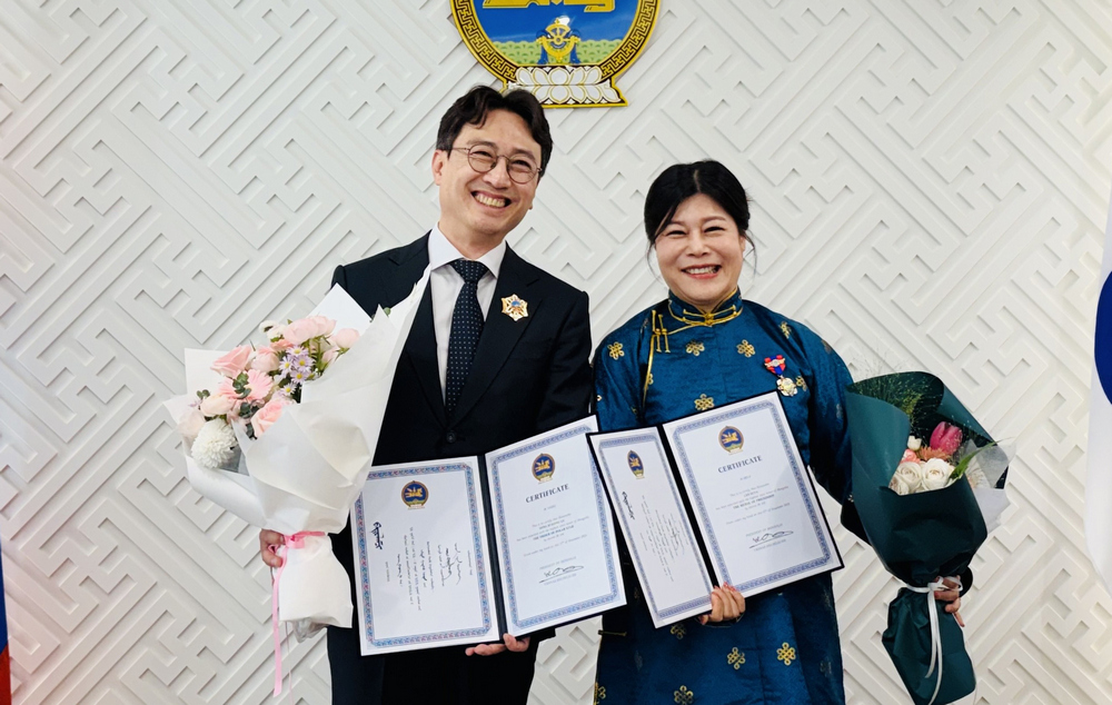 송병구 교수(아시아중동학부 몽골학전공)가 몽골 정부에서 수여하는 최고 훈장인 ‘북극성 훈장’을 받았다. 북극성 훈장은 몽골과의 교육, 문화 교류 등 양국 간 협력 증진에 기여한 인물에게 수여하며, 몽골 대통령이 수여하는 최고 등급의 친선 훈장이다. 수훈식은 지난 21일 서울 주한몽골대사관에서 열린 한·몽 수교 35주년 기념행사에서 진행됐으며, 오흐나깅 후렐수흐(Ukhnaagiin Khurelsukh) 몽골 대통령을 대신해 후렐바타르 몽골국 대통령 수석 고문이 수여했다. △ 송병구 교수(가운데)가 북극성 훈장을 받았다. 이로써 우리 대학은 ▲장충식 명예이사장 ▲장호성 이사장 ▲이성규 교수(몽골학과)에 이어 총 4명의 북극성 수훈자를 배출하게 됐다. 송병구 교수는 오랜 기간 몽골 지역학 연구와 한국-몽골 외교·경제 관계 분석에 매진해 국제적 몽골지역학자로 자리매김했다. 송 교수는 2024년부터 한국몽골학회장을 역임하며 ▶정부 외교정책 자문 ▶몽골 진출 기업 대상 컨설팅 등 실질적 기여를 통해 양국 간 정치·경제 교류 확대에 기여하고 있다. 한편, 이날 몽골학전공 이선아 교수도 몽골 대통령의 친선우호훈장인 ‘나이람달 훈장’을 수훈받았다. 이 교수는 한국몽골학회의 기획이사로 양국 간 학술교류에 크게 기여한 바가 있으며 몽골문학의 콘텐츠화를 통해 몽골문화의 우수성을 알리는 활동의 공로를 인정받았다. △송병구 교수와 이선아 교수가 함께 기념사진을 촬영했다. 우리 대학은 1993년 국내 대학 가운데 최초로 몽골학과를 설립해 한몽관계 및 학술교류를 이어오고 있다. 대학 부설 연구소인 몽골연구소는 2009년부터 2022년까지 13년에 걸쳐 세계 최대 규모의 ‘몽골어-한국어 대사전’을 편찬했으며, 교육부 한국연구재단 토대연구사업에 선정돼 동북아유목문화 대사전도 발간했다. 현재 인문사회연구소 지원사업을 통해 몽골의 정치·경제·사회 환경 비교 분석 기반 정책 결정 시스템 등을 연구하고 있다. [대학뉴스 제보] 죽전 홍보팀 : 031-8005-2032~5, 천안 홍보팀 : 041-550-1061