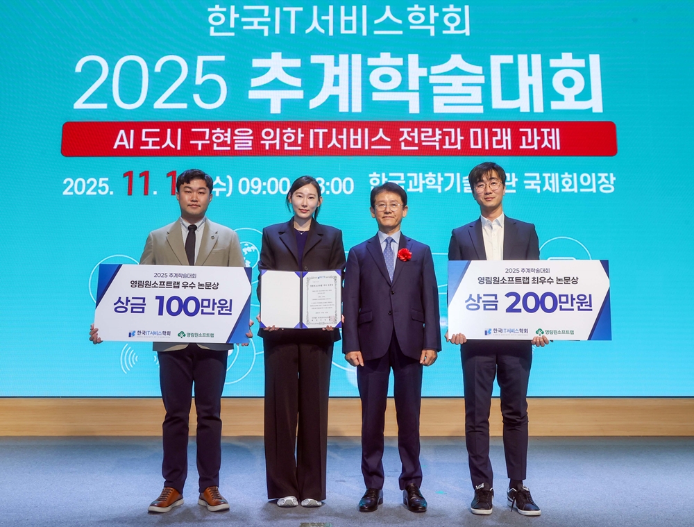 우리 대학 한휘철 박사과정생(대학원 경영학과)이 지난달 12일(수) 한국과학기술회관 국제회의장에서 열린 한국IT서비스학회 추계학술대회에서 영림원소프트랩 최우수논문상을 수상했다. △한휘철 박사과정생(맨 오른쪽)이 한국IT서비스학회 추계학술대회에서 영림원소프트랩 최우수논문상을 수상하고 기념 촬영을 하고 있다. 수상 논문 「지속가능한 제품개발을 위한 PDP_LCA통합 PLM 시스템 워크플로우 및 아키텍처 개발」은 제품개발 프로세스(PDP)와 환경영향평가(LCA)를 통합한 ‘지속가능한 제품개발 프로세스(SPDP)’를 제안하고, 이를 기업의 제품수명주기관리 시스템 안에서 구현할 수 있는 구조를 제시한 연구다. 기업이 ESG 경영 요구와 환경 규제에 선제적으로 대응할 수 있는 기반을 마련했다는 평가를 받았다. 한 박사과정생은 “연구를 지도해주신 유기동 교수님께 감사드린다”며 "앞으로도 IT서비스와 경영 융합 연구를 통해 산업 현장에서 지속가능성을 실천하고, 사회에 긍정적 변화를 확산하는 데 기여하겠다"고 소감을 밝혔다. 한편, 2002년 설립된 한국IT서비스학회는 IT서비스 분야의 학술·산업 발전을 목표로 학술대회 개최 및 「한국IT서비스학회지」 발간 등 연구 교류 활동을 이어오고 있다. #단국대 #대학원 #경영학과 #박사과정 #한국IT서비스학회 #최우수논문상 [대학뉴스 제보] 죽전 홍보팀 : 031-8005-2032~5, 천안 홍보팀 : 041-550-1061