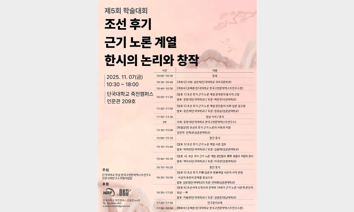 한국고전문학텍스트연구소(소장 윤재환)가 「조선 후기 근기 노론 계열 한시의 논리와 창작」을 주제로 학술대회를 개최한다. 학술대회는 오는 7일(금) 오전 10시 30분 죽전캠퍼스 인문관 209호에서 개최된다. △「조선 후기 근기 노론 계열 한시의 논리와 창작」 학술대회 포스터 이번 학술대회에서는 조선 후기 서울 및 경기 지역에 거주한 노론 계열 문인들의 시문학을 통시적 관점에서 고찰하며, 17세기 중후반에서 19세기 초반까지 이어진 노론 계열 시문학의 전개 양상과 특징을 통시적으로 조명한다. 특히 노론 계열 문인들이 추구한 시의 진실성(眞實性)과 사실적 표현 의식 그리고 학문적 수양이 한시의 창작에 미친 영향을 중심으로 논의가 진행된다. 학술대회는 1부 세션과 2부 세션으로 진행된다. 먼저 1부 세션에서는 △유명석 교수(단국대)와 백진우 교수(서강대)가 「조선 후기 근기 노련 계열 문학론의 통시적 고찰」을 발표・토론한다. △유진희 교수(단국대)와 장유승 교수(성균관대)가 「조선 후기 근기 노론 계열의 문인들의 古詩 단론 일고찰」을 발표・토론한다. 2부 세션은 진재교 교수(성균관대)가 「조선조 후기 근기 노론의 시학과 지향」을 주제로 특강을 진행했다. 이후 △박희인 교수(단국대)와 김용태(성균관대)가 「조선 후기 근기 노론 계열 시론 검토」을 발표・토론한다. △채지수 교수(단국대)와 이국진 교수(강원대)가 「조선 후기 근기 노론 계열 문인들의 眞情 표출의 지향과 한시」를 발표・토론한다. △김묘정 교수(단국대)와 안대희 교수(성균관대)가 「조선 후기 天機 담론과 노론 계열 시단의 시적 변형」을 발표・토론한다. △이황진 교수(단국대)와 김원준 교수(영남대)가 「조선시대 도학시의 전개와 18세기 근기 노론 낙론계 문인의 위상 一考」를 발표・토론한다. 윤재환 소장은 “이번 학술대회는 조선 후기 노론 계열 문인들의 시문학이 지닌 사상적 기반과 창작 논리를 체계적으로 정리하는 자리”라며 “근기 노론 계열 시단의 문학적 성격을 새롭게 조명하여, 한국 한시사의 정밀한 지형도 구축에 기여할 것으로 기대한다”라고 밝혔다. [대학뉴스 제보] 죽전 홍보팀 : 031-8005-2032~5, 천안 홍보팀 : 041-550-1061