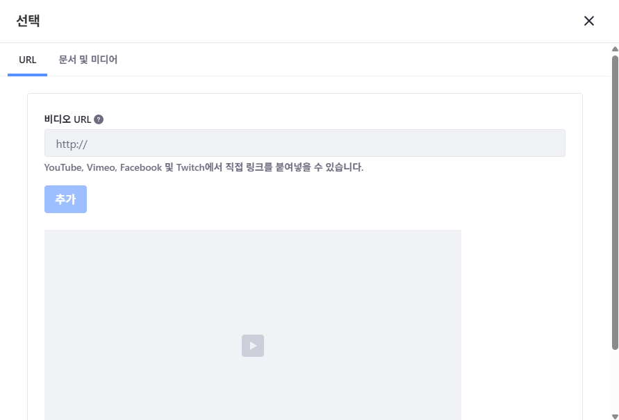 비디오 영역에 우측 [+] 버튼을 클릭하면 동영상 링크를 입력할 수 있는 팝업이 노출됩니다.