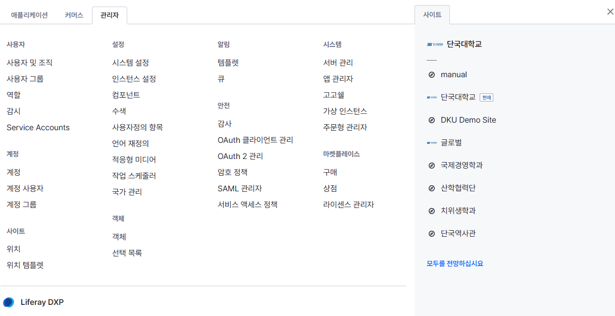 전체 사이트(대표, 단위 사이트 전부 포함)를 관리할 수 있는 관리자 패널입니다.