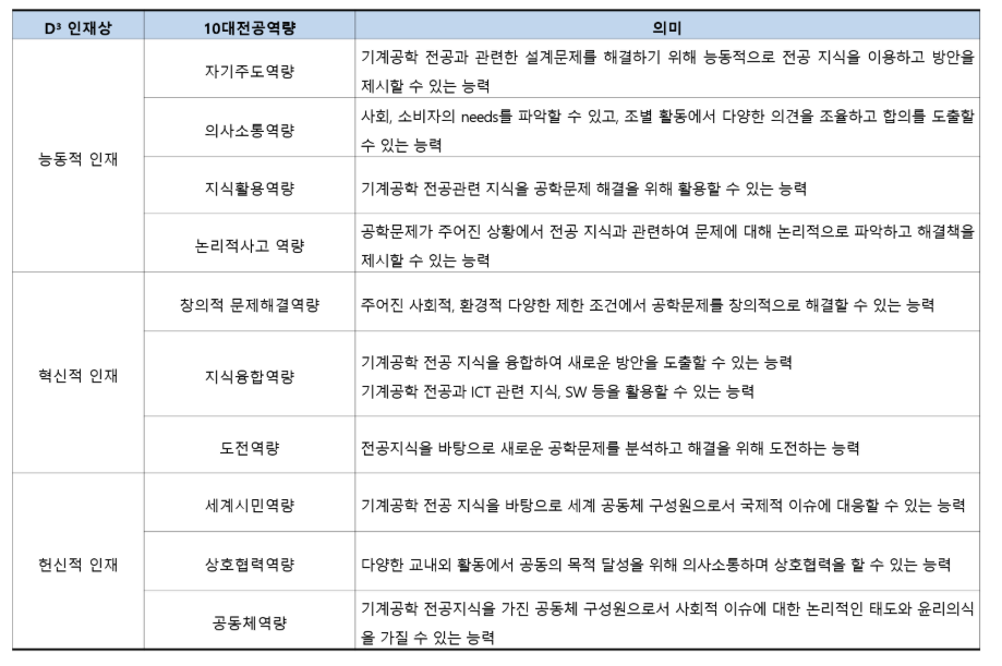단국대학교 인재상에 기반한 10대 기계공학과 전공역량은 다음과 같다.