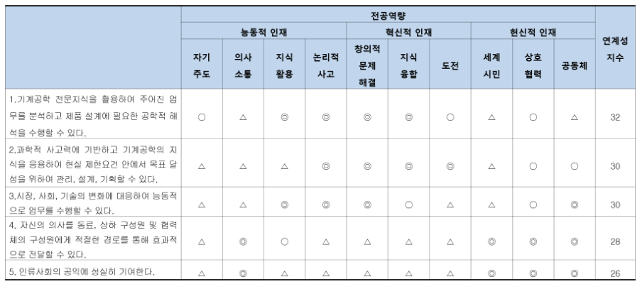 전공역량과 교육목표의 유기적 연계성을 조사한 결과 ‘① 기계공학 전문지식을 활용하여 주어진 업무를 분석하고 제품 설계에 필요한 공학적 해석을 수행할 수 있다. ② 과학적 사고력에 기반하고 기계공학의 지식을 응용하여 현실 제한요건 안에서 목표 달성을 위하여 관리, 설계, 기획할 수 있다. ③ 시장, 사회, 기술의 변화에 대응하여 능동적으로 업무를 수행할 수 있다.’와 가장 강한 연계를 보인다.