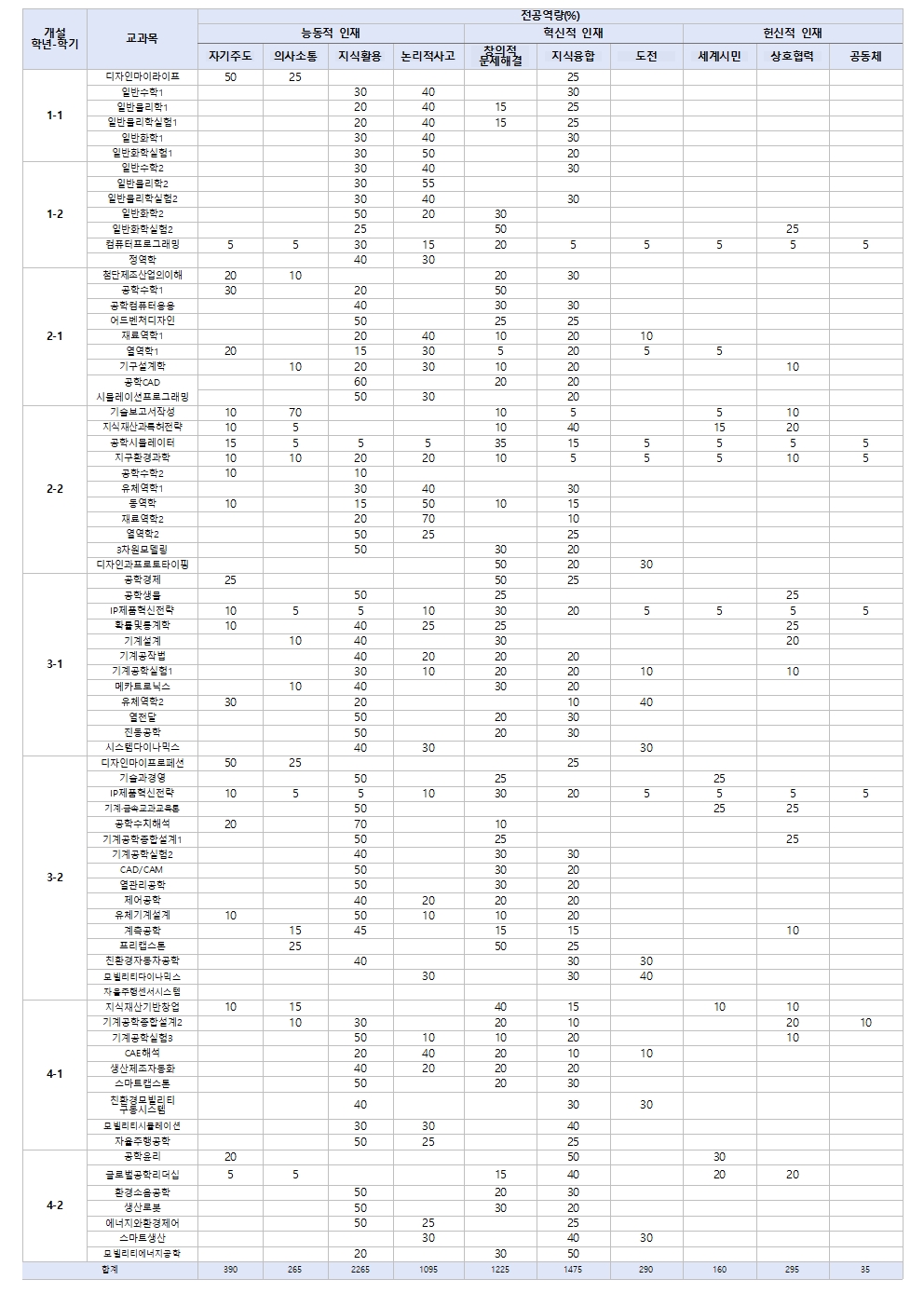 기계공학과의 전공 교과목의 전공역량 현황을 분석한 결과 ‘지식활용역량’, ‘지식융합역량’, ‘창의적문제해결역량’, ‘논리적사고역량’ 순으로 높은 연계성을 보인다.