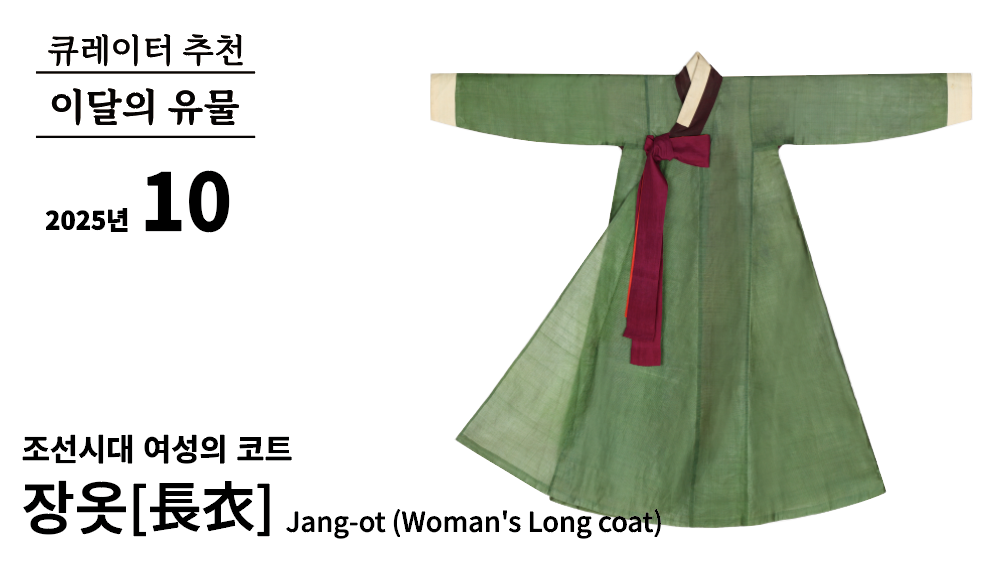 장옷 두루마기 코트 장옷은 조선시대 여성의 포(袍) 중 대표적인 옷으로 길이가 길고 품이 큰 형태이다. 장옷은 한자로 장의(長衣) 또는 규의(袿衣)라고도 불렸으며, 언문으로 ‘댱옷’이라고 쓰였다. 여성의 장옷은 18세기 이전까지는 두루마기 또는 현대의 코트처럼 저고리와 치마를 위에 외투처럼 착용하였던 옷이었다. 18세기 이후에는 얼굴을 가리는 너울의 사용이 축소되면서 착용 외에도 머리에 쓰면서 얼굴을 가리는 용도로 변화되었다. 장옷은 조선후기 풍속화에서도 자주 표현이 되는데, 녹색으로 된 긴 옷을 머리에 쓰고 있는 모습을 볼 수 있으며, 간혹 옷을 접어 머리에 이고 있는 그림도 보인다. 노인들은 장옷을 머리에 쓰기 불편하여 접어 머리에 이고 다니기도 하였다고 한다. 신윤복필 여속도첩, 국립중앙박물관소장 김홍도 필 풍속도 화첩(점괘부분), 국립중앙박물관소장 여성의 대표적인 외출용 겉옷인 장옷은 계절에 따라 소재를 달리하여 만들었다. 바람막이 코트, 트렌치코트, 울코트, 패딩코트와 같이 다양하게 현대에 착용하듯 조선시대에도 여름철에는 모시를 사용하여 홑옷으로 만들었으며, 봄과 가을에는 명주, 다양한 문양의 문단 등으로 겹옷, 겨울에는 솜을 넣어 솜장옷, 누비장옷을 만들어주었다. 겹장옷, 유인OO이씨 묘 출토, 1500년대 중후반 누비장옷, 문화유씨 묘 출토, 1615년~1685년 특히 조선 전기 문헌 기록을 살펴보면, 여성들이 장옷 위에 저고리나 당의 등의 짧은 옷을 겹쳐입는 문제를 제기하며 복요(服妖)를 금하는 상소문의 내용이 있어 남자의 장옷과 기존의 착용방식을 따르지 않은 유행을 확인해 볼 수가 있다. “ 一, 禁服妖。 蓋衣裳之制, 所以別男女貴賤也, 非下民之所敢擅便者也。 今國中女子喜着長衣若男子然, 或以長衣着於衣裳之間, 成爲三層, 轉相慕效, 擧國皆然, 疑此卽史文所謂服妖者也。” 복요(服妖)를 금하는 것입니다. 대개 의상(衣裳)의 제도는 남녀(男女)와 귀천(貴賤)을 분별하려는 소이(所以)이니, 하민(下民)이 감히 마음대로 할 수 없는 것입니다. 이제 나라 안의 여자들이 장의(長衣) 입기를 즐겨 남자와 같이 하나, 그러나 장의를 의상(衣裳)의 사이에 입어 3층(層)을 이루게 하고 점점 서로 본따서 온 나라가 모두 그러하니, 의심컨대 이것은 곧 사문(史文)에 이른바 ‘복요(服妖)’라는 것입니다. - 세조실록 3권, 세조 2년 3월 28일 정유 3번째 기사- 장옷 위에 짧은 단저고리를 입은 모습 또한 시대에 따라 옷의 크기와 형태도 변화되었는데, 품이 크면서 직선형의 형태에서 점차 품이 작아지면서 소매 등의 라인이 곡선형으로 표현되기도 하였다. 16세기 후반의 장옷, 유인OO이씨 묘 출토유물 17세기 후반의 장옷, 해평윤씨 묘 출토유물 19세기 전반기의 장옷, 덕온공주가 유물 특히 18세기 이후의 장옷은 착용과 얼굴을 가리는 용도로 사용되었기 때문에 옷을 여미는 깃의 모양과 고름의 이중적 특징이 나타는데, 홍색 고름은 착용했을 때 고름을 묶어주는 용도, 자주색 고름은 머리에 쓸 때 잡는 용도로 두 개를 부착하였으며, 고름의 위치를 대칭으로 만들어주었다. 두 개의 고름이 있는 장옷, 덕온공주가 유물 착용했을 때의 모습 머리에 씌었을 때의 모습 이번 이달의 유물에서 소개한 조선시대 여성의 장옷은 외출복으로서 방한 등의 실용성과 여성의 품위를 지키기 위한 겉옷으로서, 현대의 여성 코트와 마찬가지로 보온성과 단정한 외형을 갖춘 공통점을 가지고 있다. 장옷과 코트 모두 시대는 다르지만, 신체 보호와 사회적 격식 유지라는 기능을 지니고 있으며, 복식의 미의식을 드러내는 겉옷 문화의 연속선상에 있다고 할 수 있다.