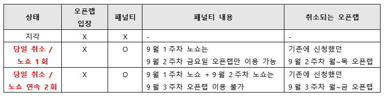⑦ 지각, 당일 취소, 노쇼 - 지각: 정시 출석 호명 이후에 도착한 경우 - 당일 취소: 예약한 이용일 당일에 이용 시간 이전에 취소 연락하는 경우 - 노쇼: 예약한 이용 시간 이후에 취소 연락하는 경우, 해당 시간 종료까지 오지 않은 경우 - 당일 취소 또는 노쇼 1회: 그 다음주 오픈랩 - 금요일만 신청 가능 (이미 신청한 월~목 오픈랩은 자동 취소 처리함) - 당일 취소 또는 노쇼 2회: 그 다음주 오픈랩 - 신청 불가 - 오픈랩 지각, 취소, 노쇼는 성적에 반영되지 않으며, 오픈랩 신청 패널티만 있습니다