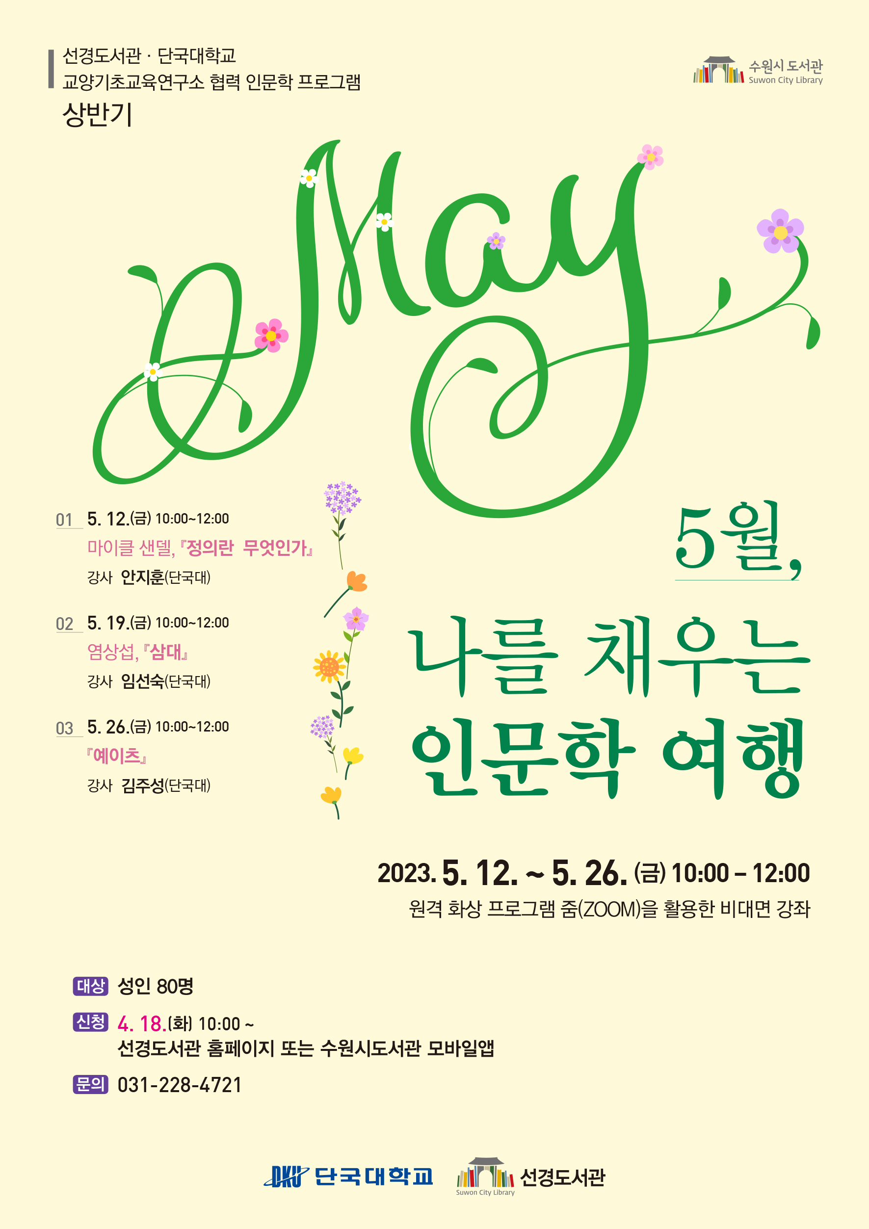 단국대학교 교양기초교육연구소에서 지역사회 주민과 함께하는 고전읽기 프로그램 제6기 수원시민과 함께 하는 「나를 채우는 인문학 여행」를 시작합니다.