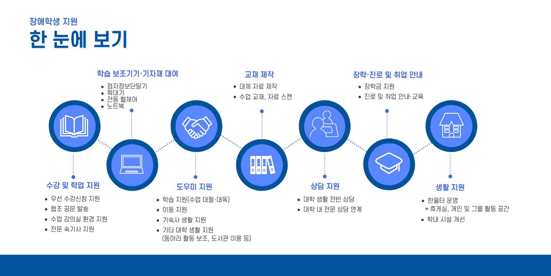비 장애학생과 동일한 조건에서 대학생활을 할 수 있도록 교수‧학습 지원 및 편의 시설 이용에 관한 지원을 한다.